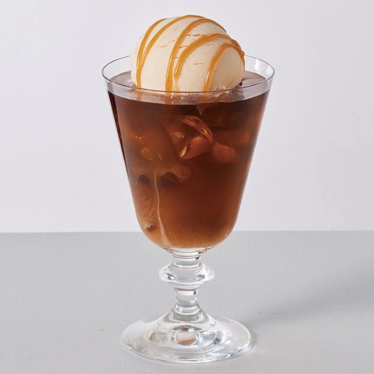 喫茶店の定番メニューを再現。香ばしさにアイスクリームのまろやかさが重なった、風味豊かで懐かしい味わい。 【材料(1人分)】 カフェインレス ブラジル& コロンビア…70mll バニラアイスクリーム…適量 (トッピング用)キャラメルシロップ…適量 【作り方】 ①グラスに氷を入れてマシンにセット。【COFFEE/Iced/湯量1】モードでコーヒーを抽出。 ②①のグラスにバニラアイスクリームをのせ、キャラメルシロップをトッピングして完成。