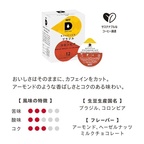 南米を代表するブラジルとコロンビアをブレンド。ブラジルの甘みと香ばしさ、コロンビアのクリアな酸味とコクが調和し、コーヒー本来の深みと香りがしっかりと感じられる、心地よい余韻が広がるカフェインレスコーヒーです。