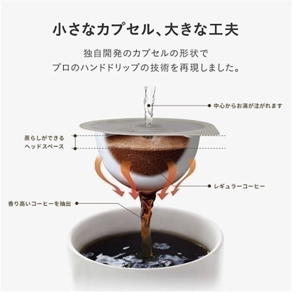 おいしさの秘密は、しっかりと蒸らしができるカプセルの中に。プロのハンドドリップの技を再現した「湯温」「抽出速度」「蒸らし時間」により、ボタンひとつで本格的なコーヒーが淹れられます。