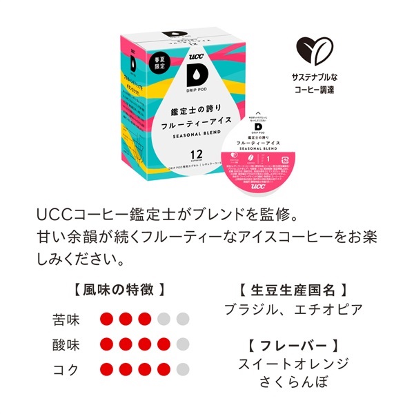 【春夏限定】ドリップポッド公式ストア限定発売! 果実のような華やかな香りと、澄んだ甘みが広がるフルーティーな一杯です。 夏に心地よい、華やかな香りとやさしい甘さの余韻を楽しむアイスコーヒーをお楽しみください。