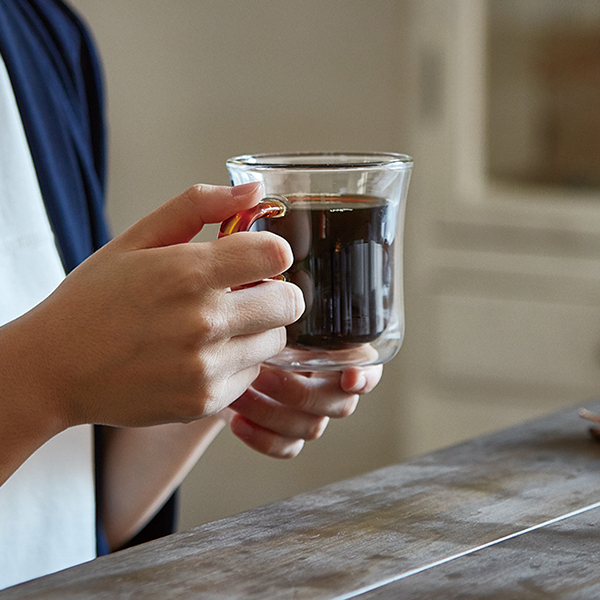 冷たい飲み物をいれても、外側のガラスが結露しにくく、熱い飲み物をいれても、カップ側面や口元が熱くなりにくくなっています。